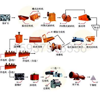 【生产能力】:0.18-7(m³/min) 【组成部件】: 振动给料机(槽式给料机)—>PE颚式破碎机(粗破)—>PEX颚式破碎 机(细破)—>振动筛—>料仓—>摆式给料机(电磁振动给料机)—> 球磨机—>螺旋分级机(高频筛)—>搅拌桶—>浮选机—>湿精矿—> 浓缩机—>压滤机(过滤机)—>烘干机—>干精粉—>摆式给料机( 电磁振动给料机)—>球磨机—>螺旋分级机(高频筛) 【技术优势】:该生产线具有低能、处理量高、经济合理等优点。 【生产线介绍】: 选矿生产线由颚式破碎机、球磨机、分级机、搅拌桶、浮选机、浓 缩机和烘干机等主要设备,配合给矿机、皮带输送机可组成 完整的选矿生产线。该生产线具有低能、处理量高、经济合理 等优点。 |